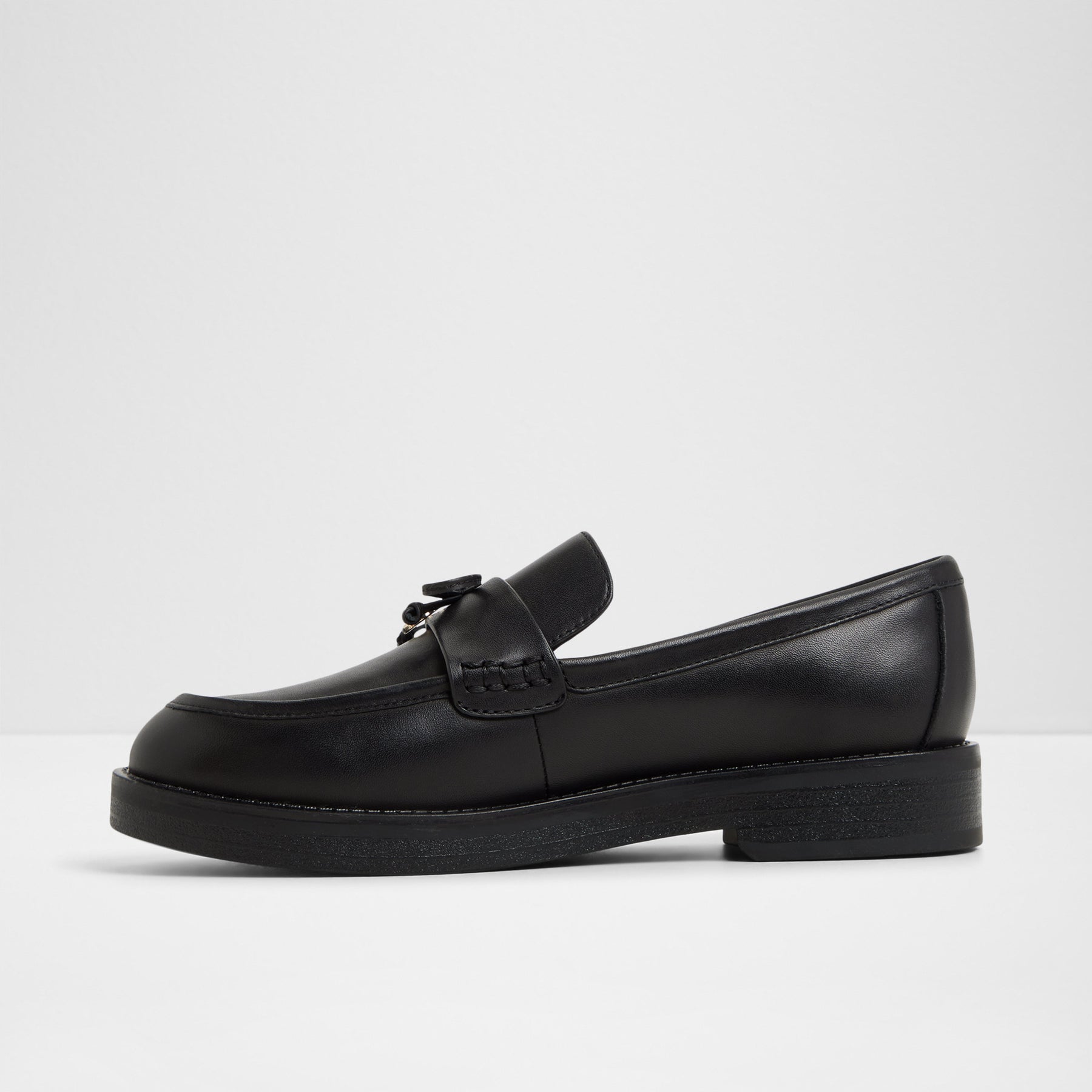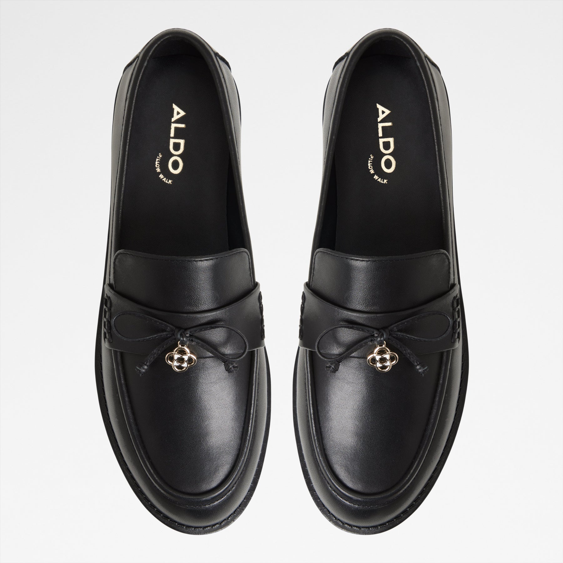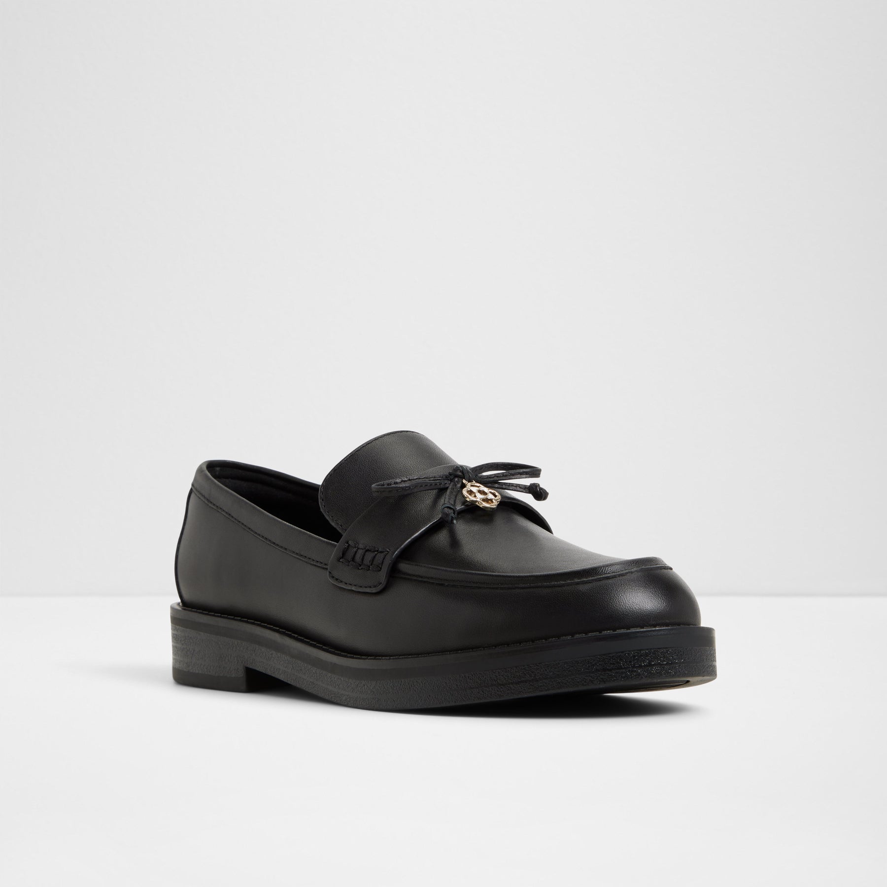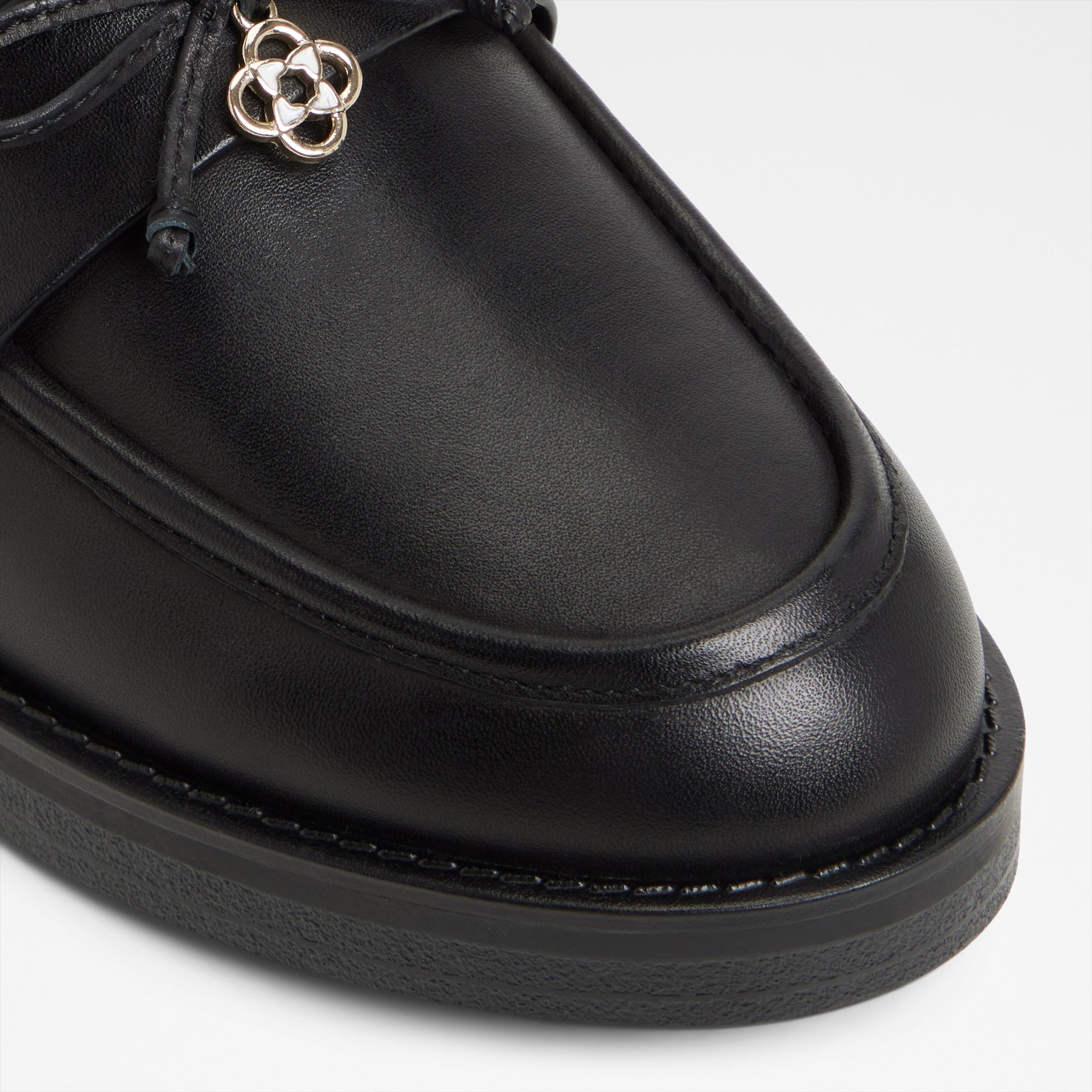 Mocassins rasos GWAJAR para mulher, em pele, em preto, com biqueira redonda e um aplique decorativo em forma de laço.
