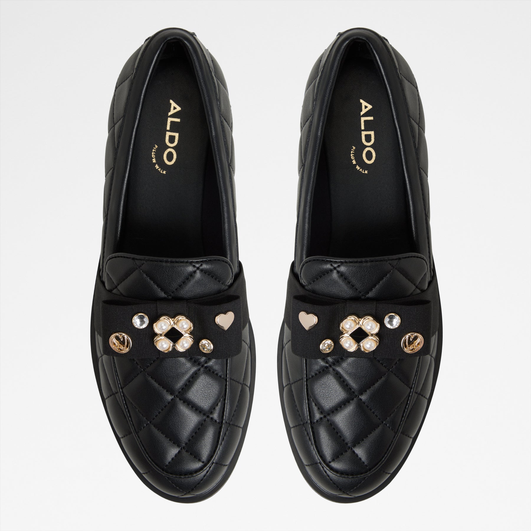 Mocassins rasos BISSAMO para mulher, em preto, com biqueira redonda e uma textura acolchoada. Com apliques decorativos.