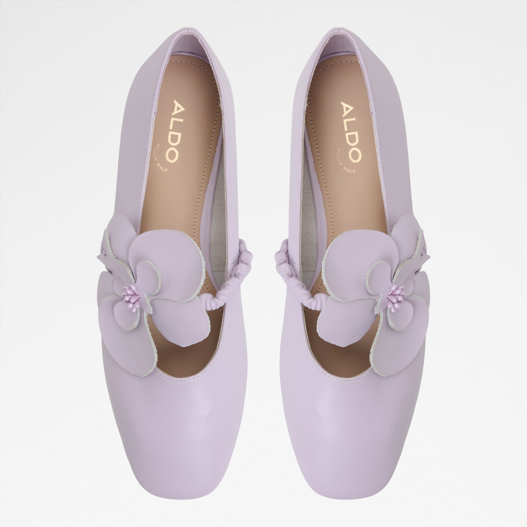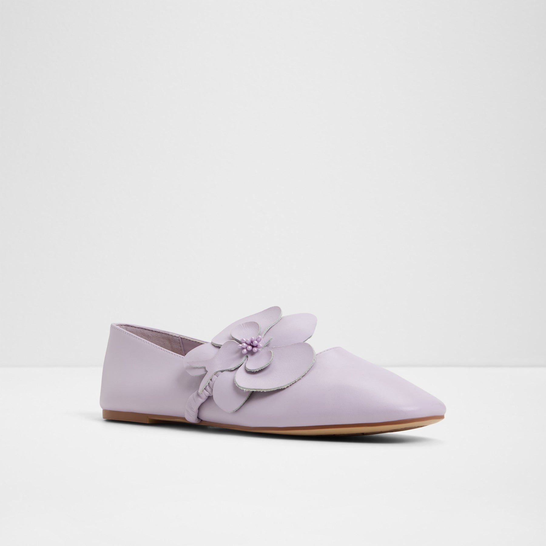 Sapatos rasos FLORALINA para mulher, em pele, em lilás, com biqueira quadrada e aplique em forma de flores. Com ajuste em elástico.
